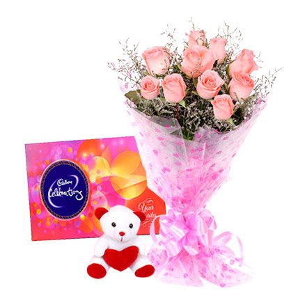 SKU: Bunch of 12 pink roses with 6 inch Teddy Bear or Cadbury's Celebration Categories: Buy online Diwali Gifts, Chocolates, Combo Offers, Roses Tags: Bunch of 12 pink roses with 6 inch Teddy Bear or Cadbury's Celebration, teddy bear in Gurgaon